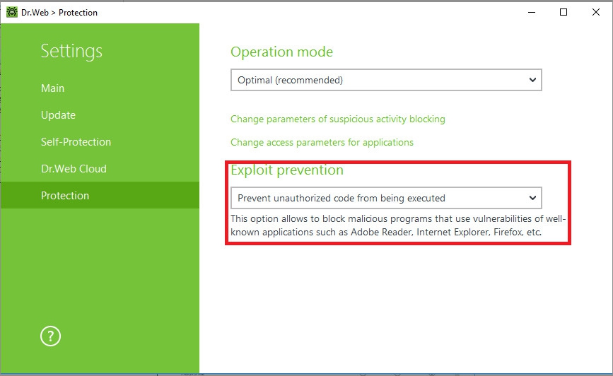 - Dr.Web Katana คอยป้องกันมัลแวร์ (Malware) เวอร์ชันล่าสุดที่เล็ดลอดการตรวจจับโดยการสแกนหาซิกเนเจอร์แบบดั้งเดิม (traditional signature-based scanning) และกลไกการช่วยแก้ปัญหา (heuristic mechanisms) โปรแกรมเหล่านี้ยังไม่ถูกวิเคราะห์โดย anti-virus laboratory และดังนั้นจึงเป็นโปรแกรมที่ Dr.Web ไม่รู้จักในขณะที่ทำการคุกคามโปรแกรมเหล่านี้หมายรวมถึง encryption ransomware เวอร์ชันล่าสุด Trojan injectors และ Trojan blockers เช่นเดียวกันกับการโจมตีแบบ Zero-day ที่ใช้ประโยชน์ (exploits) จากช่องโหว่ (vulnerability)