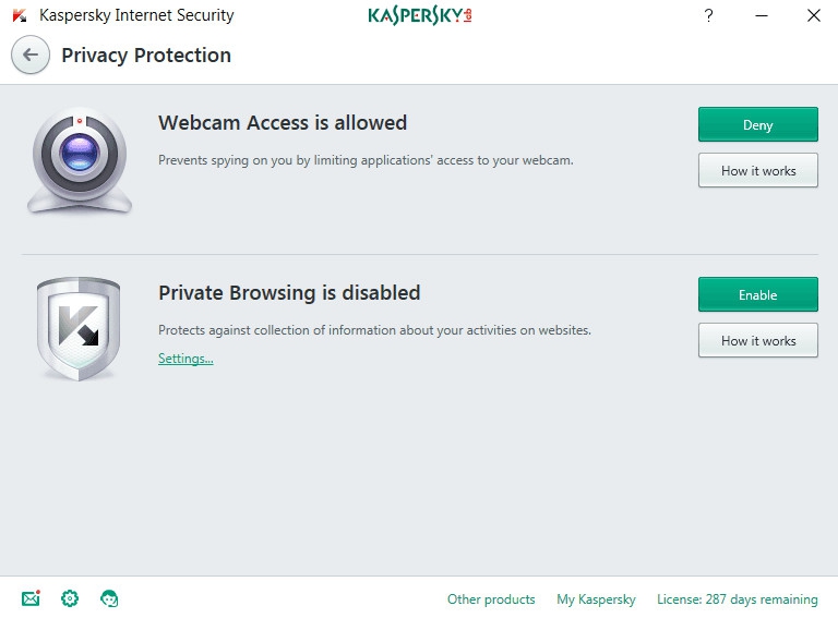 โปรแกรมแอนตี้ไวรัส Kaspersky Internet Security มีเครื่องมือใช้งานง่ายจำนวนมาก ที่ช่วยดูแลเรื่องความเป็นส่วนตัวของข้อมูลให้กับสมาชิกครอบครัว โดยเมื่อเราท่องเว็บไซต์ ก็มีเครื่องมือ Private Browsing ช่วยป้องกันไม่ให้เว็บตามติดกิจกรรมของเรา และปิดกั้นการเก็บข้อมูล ทำให้เว็บไซต์ไม่สามารถรบกวนเราด้วยการแสดงแบนเนอร์โฆษณาที่น่ารำคาญ