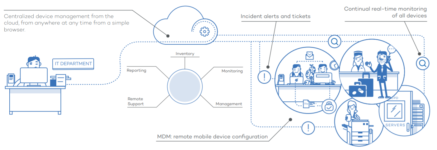 Panda Systems Management โซลูชันสำหรับงานด้านการดูแลระบบคอมพิวเตอร์ในองค์กรธุรกิจ ที่มีความสามารถรอบด้าน ดูแลความพร้อมใช้งานของ เครื่องคอมพิวเตอร์ เซิร์ฟเวอร์ เครื่องพิมพ์ อุปกรณ์พกพาทั้ง สมาร์ทโฟน และแท็บเล็ต ทั้งบนระบบปฏิบัติการ iOS และ Android เฝ้าจับตามองการทำงานของทุกอุปกรณ์คอมพิวเตอร์ที่มีอยู่เป็นจำนวนมากในธุรกิจ ว่ามีความพร้อมใช้งานในระดับใด ซอฟต์แวร์ที่ติดตั้งอยู่ล้าสมัย หรือต้องการอัปเดตหรือไม่ มีฮาร์ดแวร์อะไรติดตั้งอยู่ในเครื่องบ้าง และมีการแจ้งเตือนเมื่อเกิดปัญหา อาทิ ฮาร์ดดิสก์ของเครื่อง คอมพิวเตอร์/เซิร์ฟเวอร์ ใกล้เต็ม หรือหมึกของเครื่องพิมพ์ใกล้หมด และในกรณีที่อุปกรณ์พกพาอย่าง สมาร์ทโฟน หรือแท็บเล็ต ถูกโจรกรรม ก็สามารถ สั่งล็อกเครื่อง สั่งลบข้อมูลจากระยะไกลได้ด้วย ทำให้ข้อมูลความลับของธุรกิจที่อยู่ในอุปกรณ์ ไม่รั่วไหลออกไป